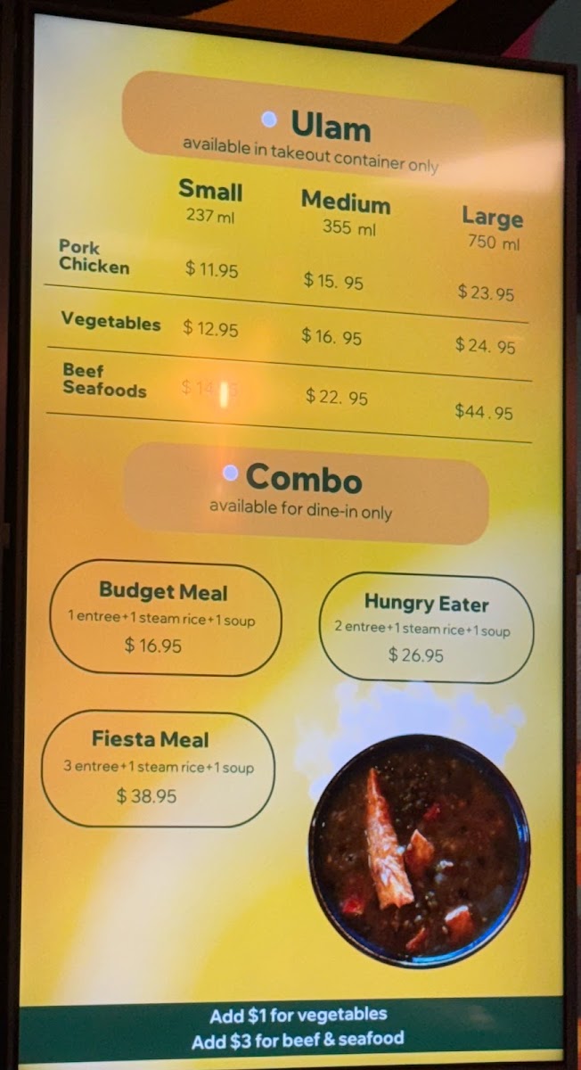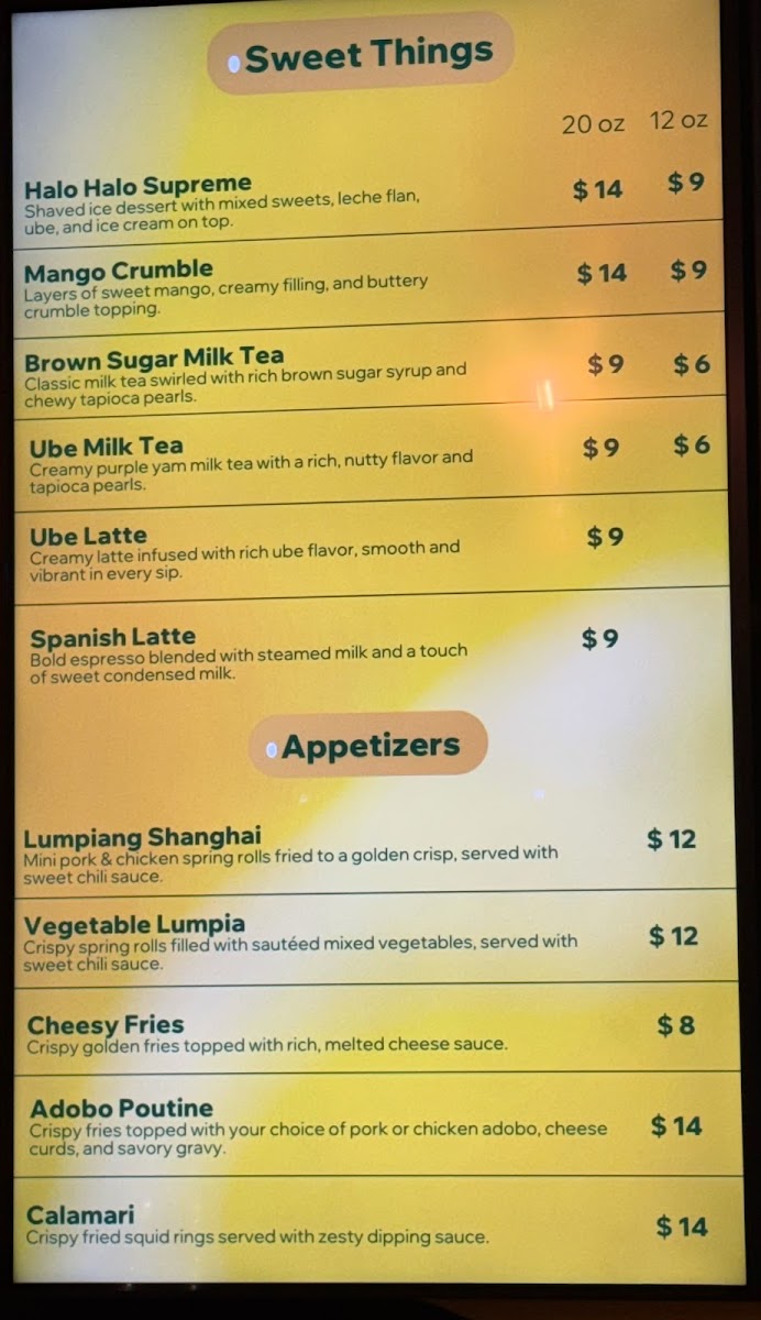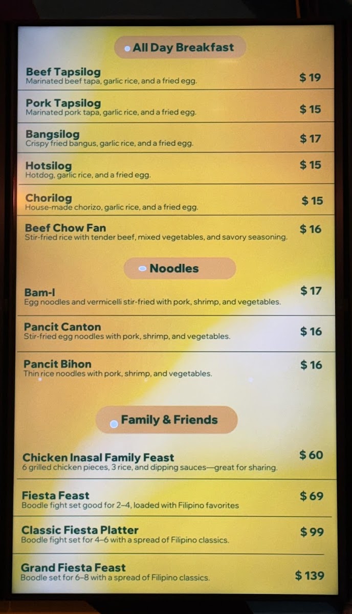 Overall, the menu provides a diverse range of Filipino baked goods, meals, beverages, and grocery products, designed to accommodate quick orders, light refreshments, and full meals in a casual setting.